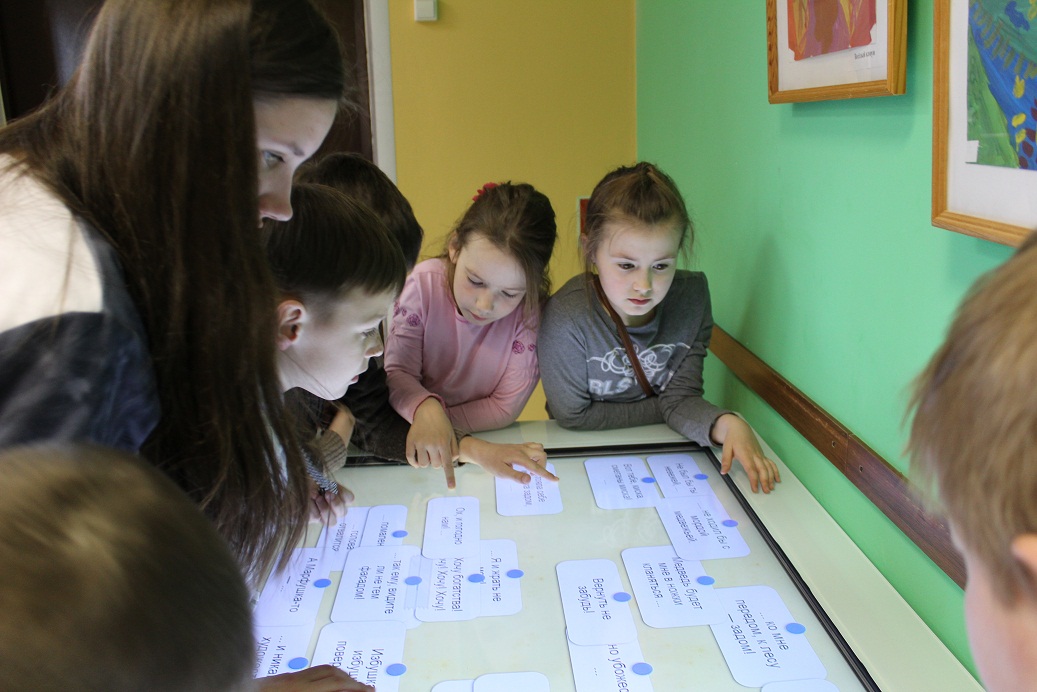 Интерактивная викторина, состоящая из фраз киносказок А. Роу, вызвала немало затруднений, но возможность самому попробовать составить предложение из двух частей в единое целое, используя волшебный мультитач-стол, вызвала неописуемый восторг и желание довести начатое до конца.