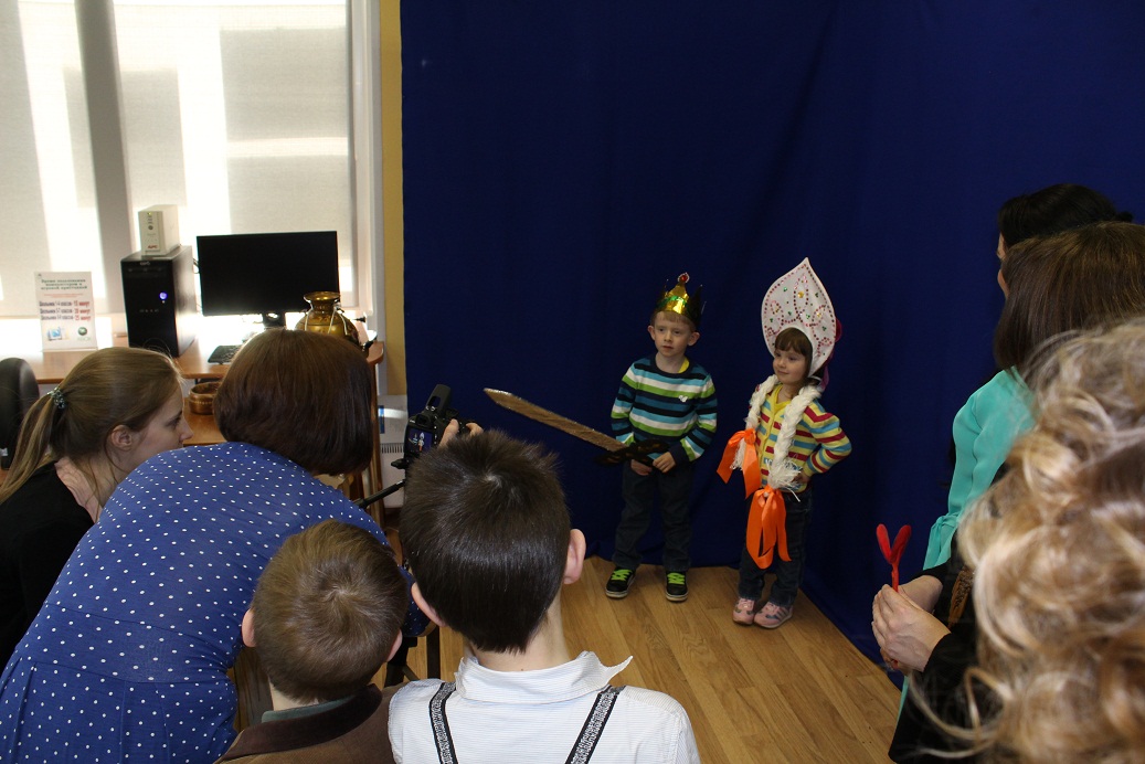 Распахнутый книжный чемоданчик, где спрятались образы узнаваемых героев русских сказок, также не оставил равнодушным малышей и взрослых. Сколько ассоциаций и невероятных историй можно придумать всем вместе. Мультстудия "Мультиварка" тоже приготовила для малышей и их родителей феерический сюжет «Новые похождения бабки Ёжки». Дети в образах Бабы – Яги и Кощея Бессмертного, проявив свое актерское мастерство, снимали мультипликационный ролик, демонстрируя чудеса превращения и оживления героев сказок.