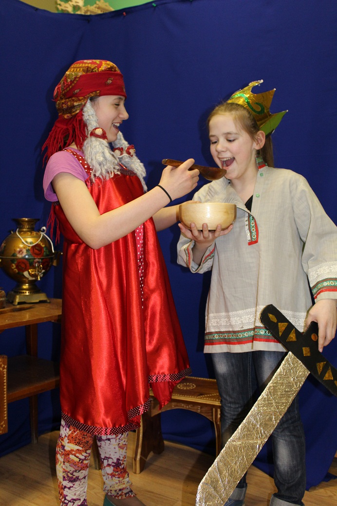 Любимые герои русских сказок Василиса Премудрая и Иван-царевич по - русскому обычаю встречали гостей с хлебом-солью, приглашая каждого найти развлечение (историю) по душе.