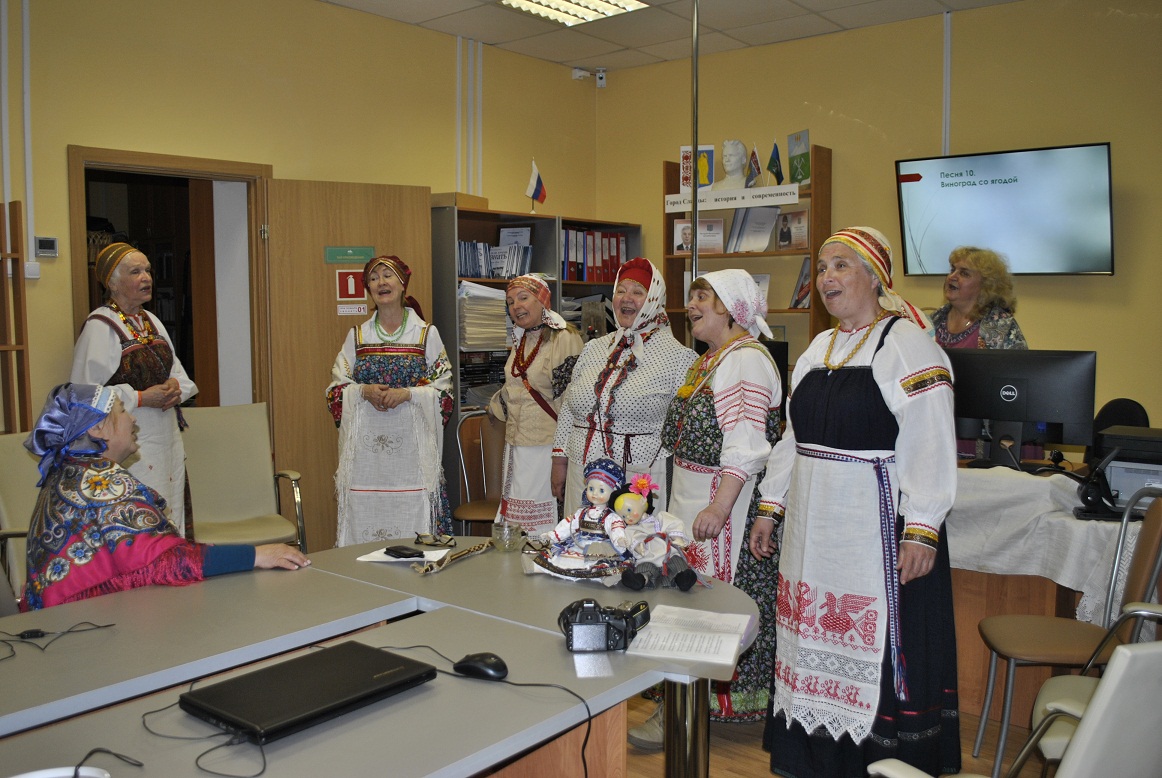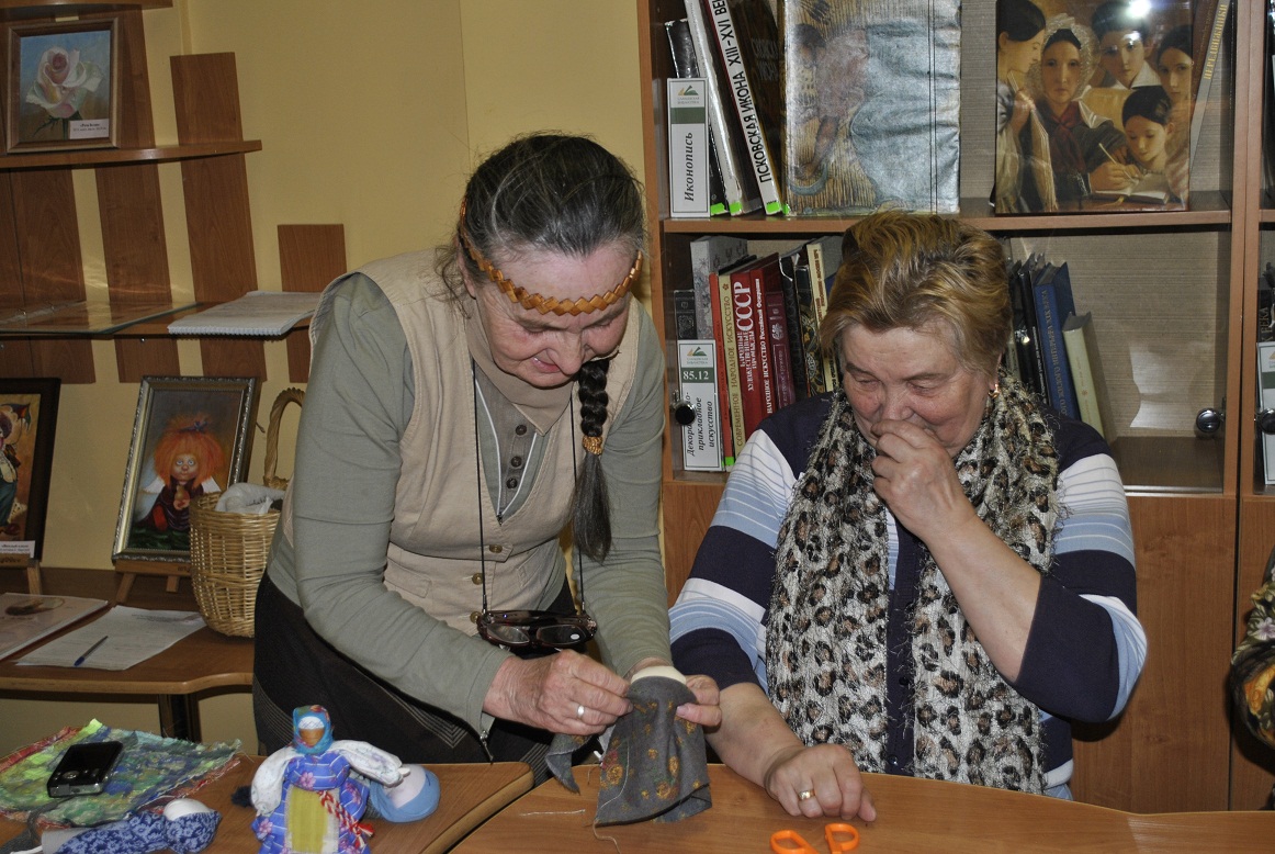 Всё, что сделано своими руками обладает огромной энергетикой! Это не уставала повторять руководитель творческой мастерской «ЛИКО» Людмила Дмитриевна Безъязыкова на мастер-классе по изготовлению тряпичной куклы убоженьки. Странное название. Но как объяснила Людмила Дмитриевна, мастерили таких кукол для детей с целью научить их состраданию к ближнему. Куколки, процесс изготовления которых состоит в накладывании и привязывании лоскутков разных форм из разных тканей, на самом деле получались милые, их хотелось прижать и пожалеть. Жалейка – ещё так называли эту куклу. Взрослые женщины, пришедшие в этот вечер в библиотеку на мастер-класс, были очень увлечены процессом. И радовались, как дети, что у них получается. Слушать песни в исполнении участниц этнографической мастерской «Манефа» под руководством Заслуженного работника культуры Евгении Тимофеевны Беляцкой - одно удовольствие. Весёлые, игривые, печальные – в репертуаре коллектива есть всякие.