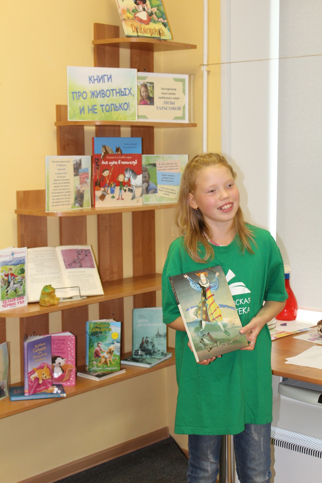 А ещё в день открытия нового книжного сезона свою авторскую выставку любимых книг «Книги про животных и не только…» представила лидер чтения ЛИЗА ТАРАСОВА. Лиза рассказала ребятам про любимые книги и любимых писателей и продемонстрировала своего самого экзотического домашнего питомца – огромную улитку! Эта встреча дала возможность девочке поделиться со сверстниками своими книжными и некнижными увлечениями, а читателям – пообщаться с интересным человеком.