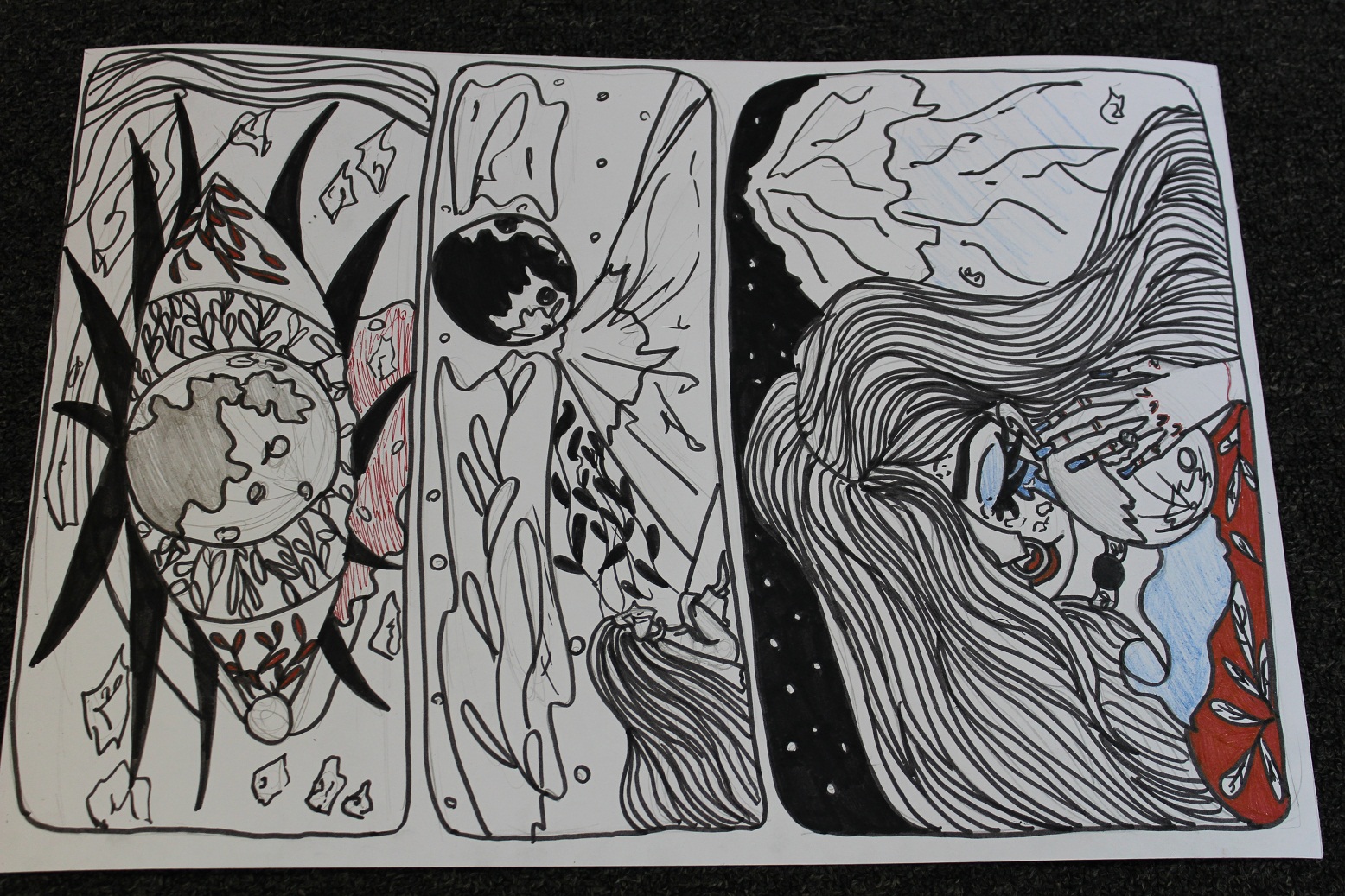«Мы рисовали графические иллюстрации к хайку. Я победила в конкурсе! Было сложно за столь короткий промежуток времени успеть выплеснуть все свои идеи на лист. Жаль, что не получилось передать все мелкие детали, ведь времени было всего час», -