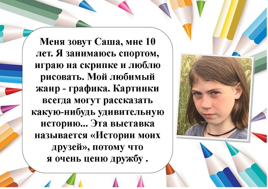 И ещё одна выставка – рисунков Саши Забелкиной «История моих друзей» оставила свежее, приятное впечатление. Саша сумела живо и образно рассказать о своём творчестве. Строгий стиль графических работ не умаляет жизнерадостности и самобытности её творчества.