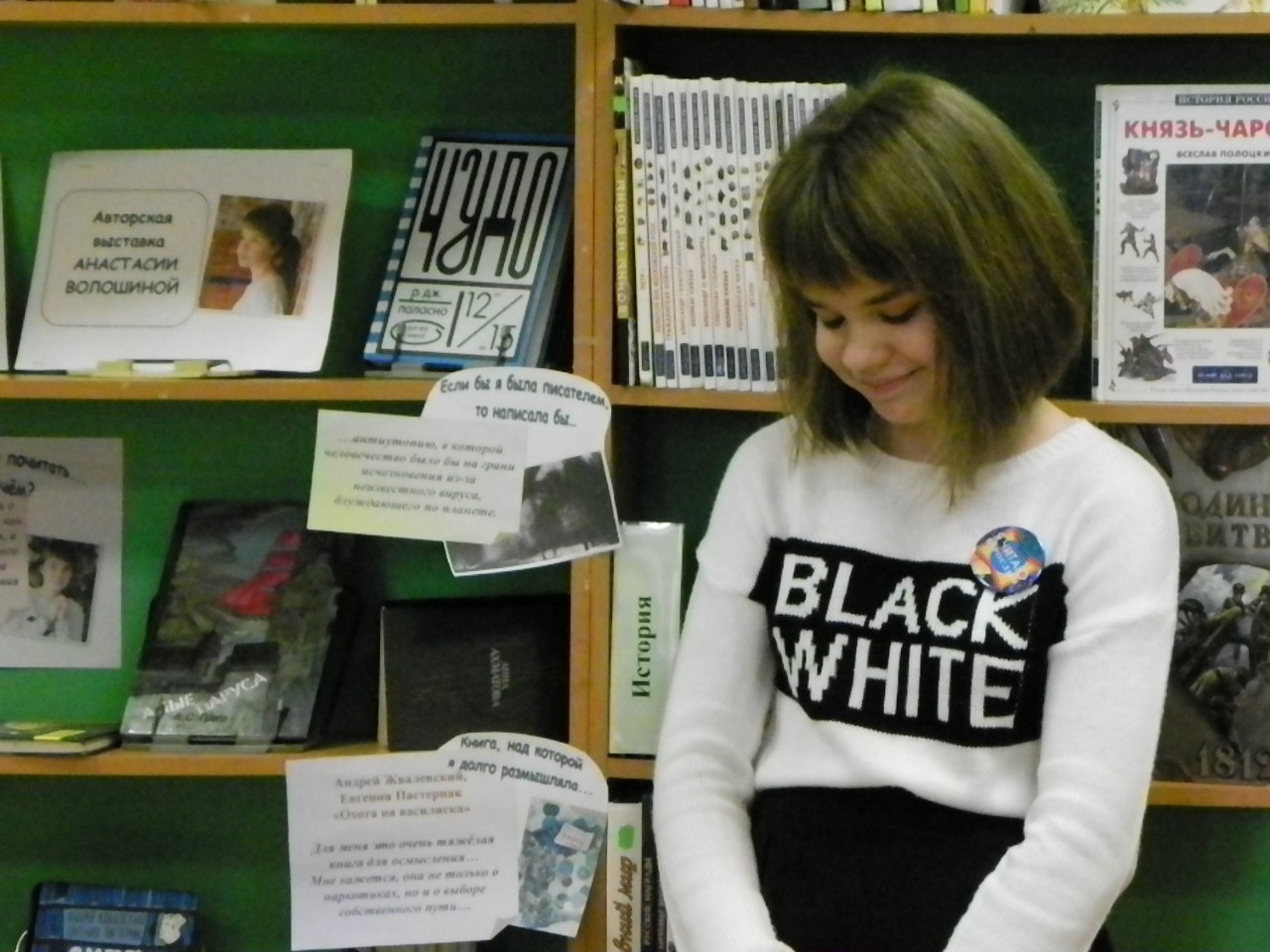 На открытиях авторских читательских выставок «Это мое чтение!» о своих любимых и нелюбимых книгах, писателях, литературных жанрах нам рассказали наши читатели Евгения Гусева, Илья Калиниченко, Анастасия Волошина и Анастасия Воробьёва. Женя Гусева представила читателям свою выставку «Мои книжные приключения», где представила свою любимые книги в приключенческом жанре. Илья Калиниченко стал автором выставки «Я люблю совершенно разные книги», на которой рассказал о серьёзных, проблемных книгах для подростков. Настя Воробьёва провела презентацию выставки «Моё читательское Я» и представила свою коллекцию книг с автографами писателей. Настя Волошина на своей выставке «Маленькая книжная тележка» представила книги, которые были особенно интересны и значимы для неё, и рассказала о своих любимых книжных героях.