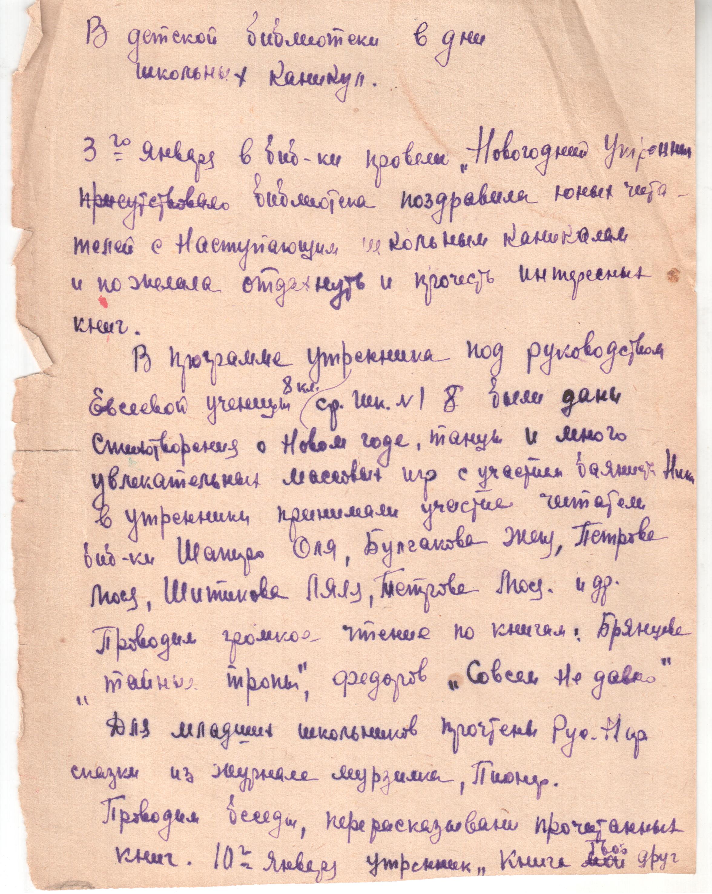 В 50 – 60-х годах в детской районной библиотеке практиковались такие формы мероприятий: громкие чтения, утренники, игры, читательские конференции. Во главу угла ставилась историко-патриотическая работа. Вот, например, в 1950 году была проведена читательская конференция на тему «Пионеры-ленинцы своей Родины», подготовка шла 2 месяца.