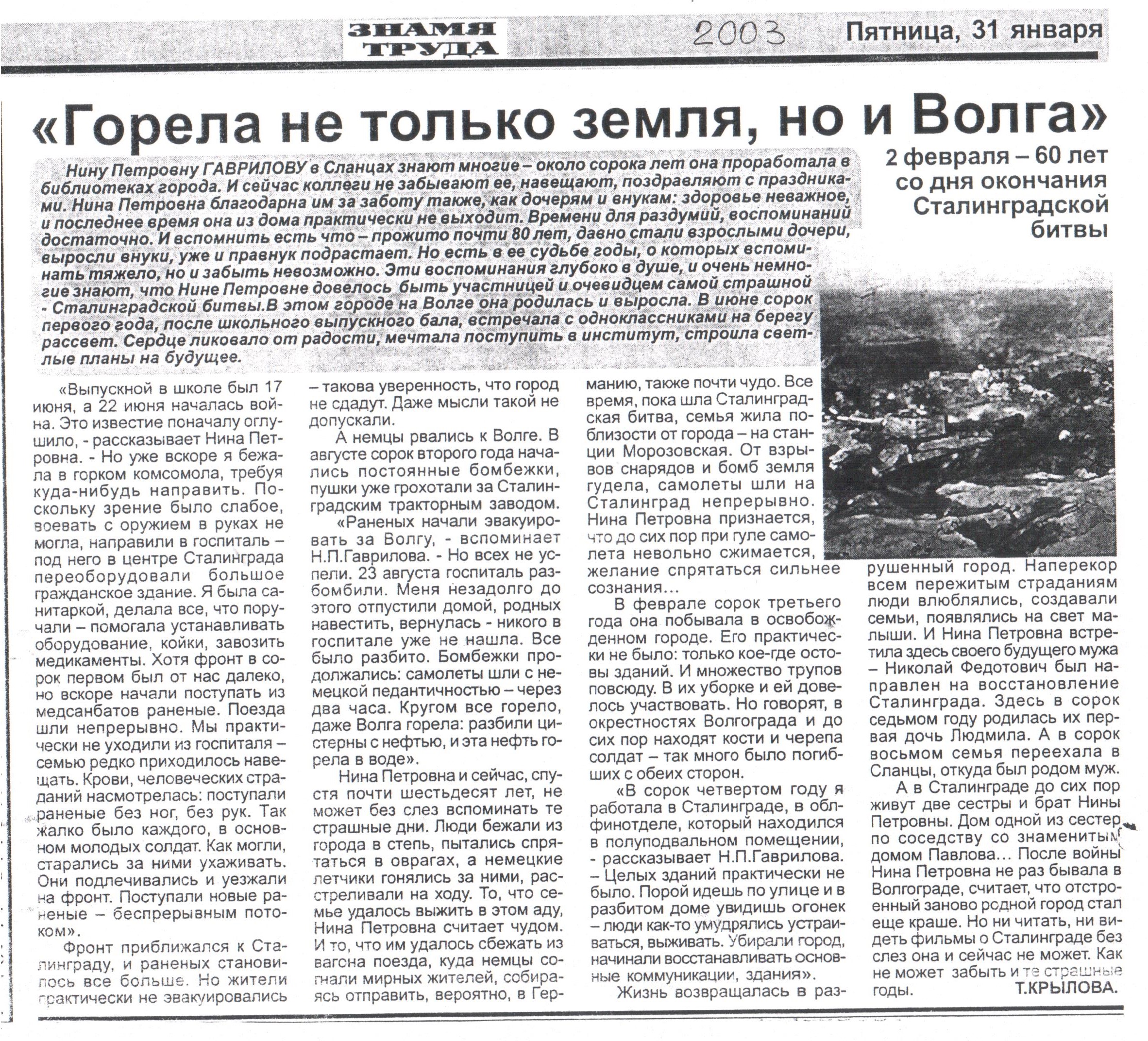 Н.П.Гаврилова родилась на Волге в городе Царицын, который был переименован в Сталинград. Сталинград стал особой вехой в судьбе Нины Петровны. Ей, семнадцатилетней девчонке, окончившей среднюю школу в 41-м году, пришлось стать участником Великой Отечественной войны. Поскольку зрение у Н.П.Гавриловой было слабое, воевать с оружием в руках не могла, и её направили в эвакогоспиталь. А потом – осада города, историческая битва – и все эти события были пережиты вместе с родным городом. Подробнее о том времени Нина Петровна рассказала в интервью местной газете.