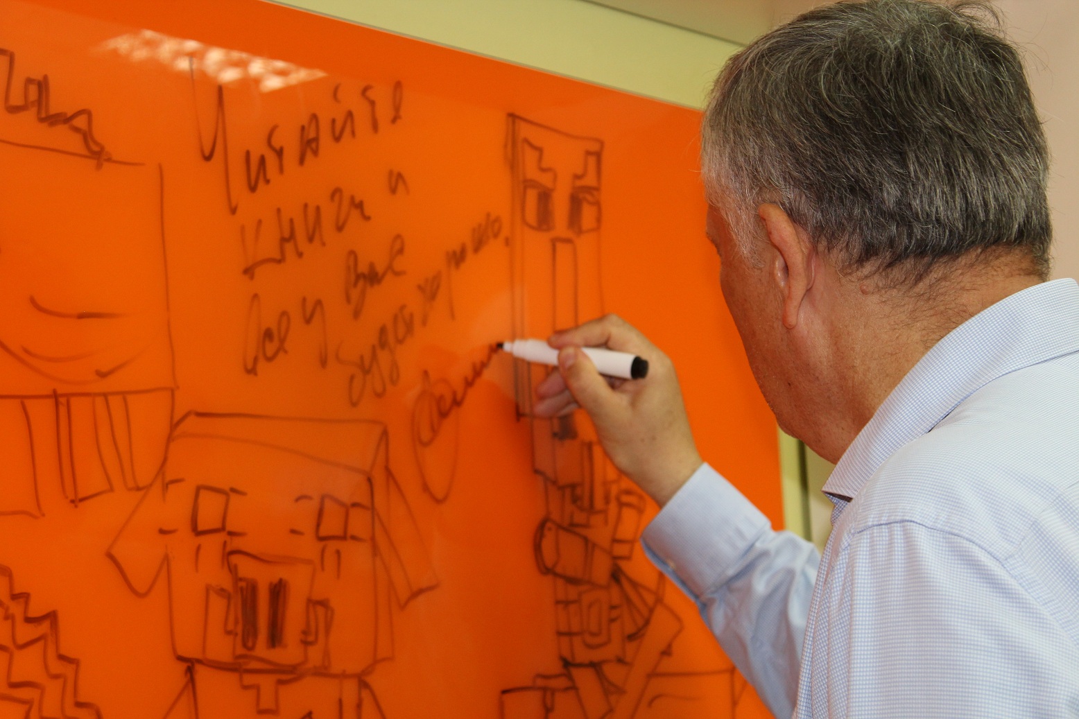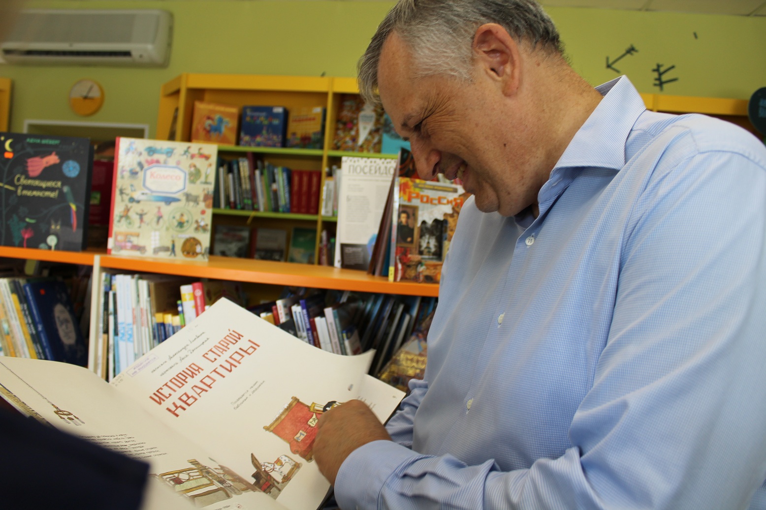 В зале «1001 точка чтения» на интерактивном столе ему предложили написать любимого книжного героя детства, на магнитно-маркерной доске Александр Юрьевич оставил своё пожелание: «Читайте книги, и всё у вас будет хорошо!». У «полки комиксов» признался, что одна из его дочерей большая поклонница этого жанра. Увидев книгу «Старая квартира» в зале «нон-фикшн», с удовольствием полистал её, вспомнив своё детство, проведённое в коммунальной квартире в Разметелево. В «Уют-компании» с интересом листал книг и с автографами авторов, подаренные Сланцевской детской библиотеке. Покидая модельную библиотеку, Александр Юрьевич сказал: «Сланцевская библиотека, вы – лучшие!».