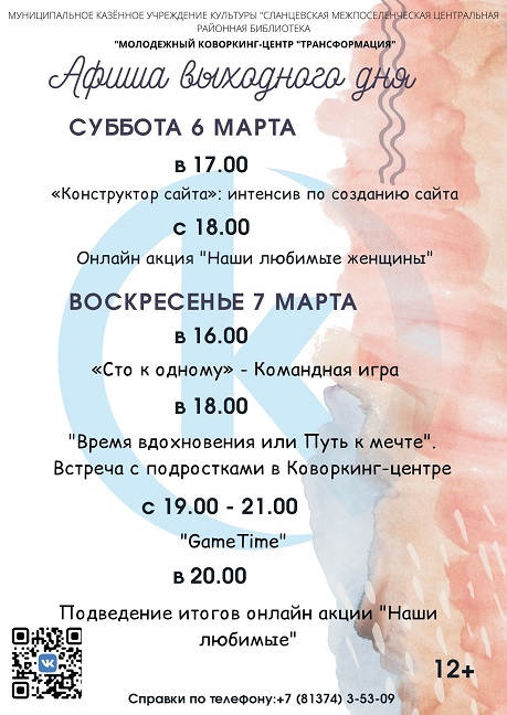 В 18.00 онлайн-акция, посвящённая Международному женскому дню с размещением в группе «Молодёжный коворкинг-центр «Трансформация» в социальной сети ВКонтакте Инстаграм поздравления с хештегом #НашиЛюбимыеЖенщины