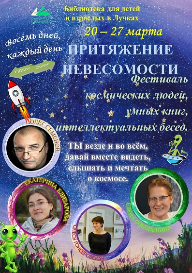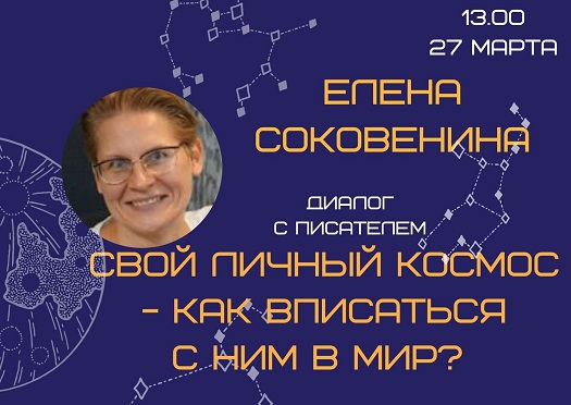 В 13.00 «Свой личный космос - как вписаться с ним в мир»: диалог с писателем Еленой Соковениной (онлайн, г. Рига). дети смогут поговорить с писателем на разные темы: о детях и взрослых, взаимном понимании и непонимании, о чудаках и авантюристах... И о космосе, конечно!