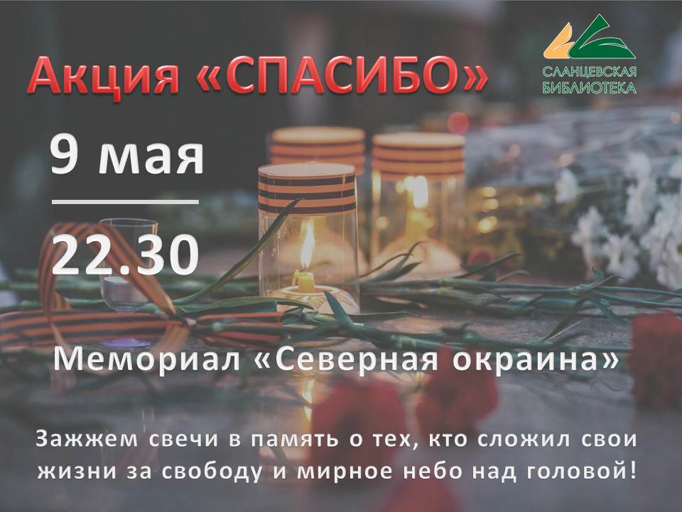 В Сланцевской публичной библиотеке (г. Сланцы, ул. Ленина, д. 19) В 22.30 акция «Спасибо» - зажжение свечей в благодарность всем воевавшим и павшим за наше мирное небо над головой за четыре долгих года Великой Отечественной Войны.