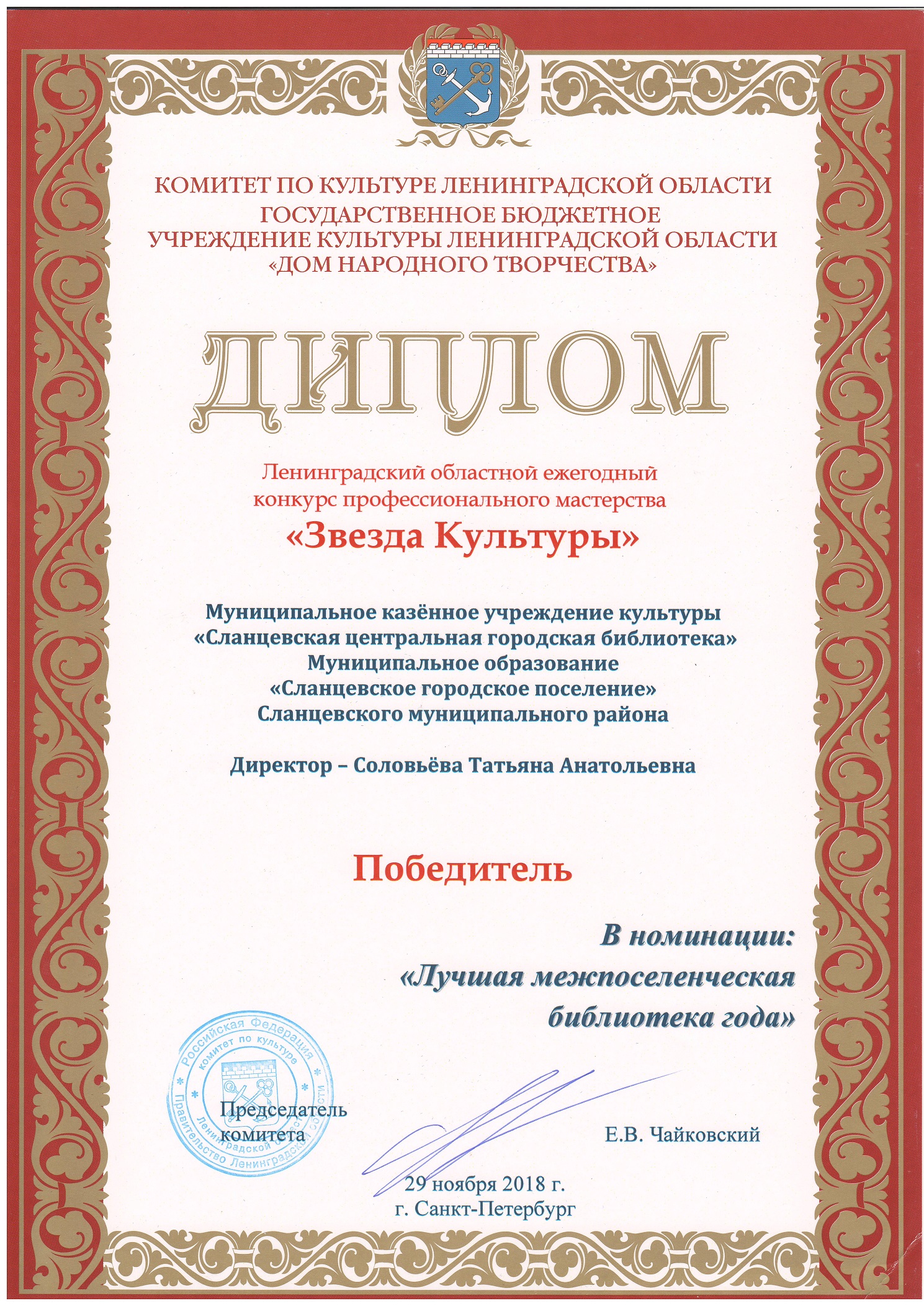 В номинации «Лучшая межпоселенческая библиотека года» Диплом победителя был вручен Сланцевской центральной городской библиотеке. Кроме того, библиотека получила сертификат на денежные средства. Полученный за победу в конкурсе грант даст нам возможность привлечь в город и открыть жителям новые ресурсы, повысить свою значимость, компетентность, востребованность.