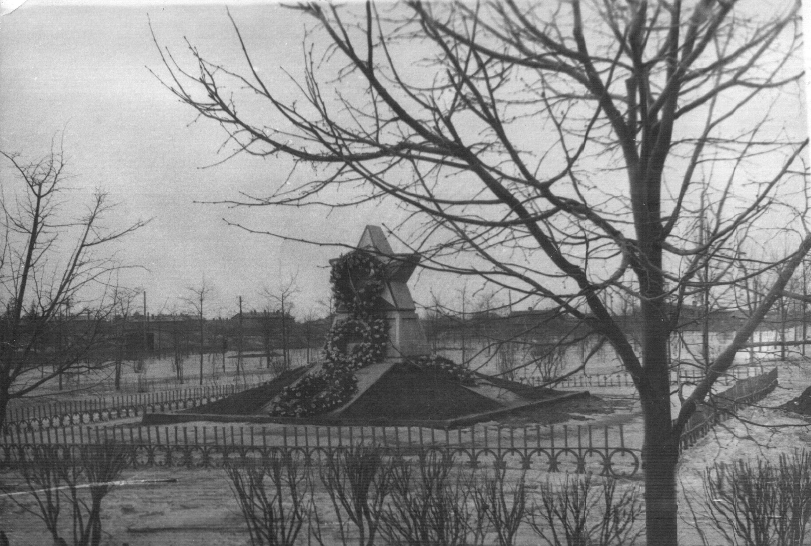 Захоронение состоялось в ноябре 1944 года. Имеется фотография захоронения 1940-х гг. до установки на нем обелиска. Обелиск был установлен позже. Дата установки памятника по «Учетной карточке воинского захоронения» и карточке «Исторический памятник» – 1945, по материалам книги Иванова В.В. «Сланцы» - 1947. Решение об установке памятника было принято в Сланцевским РИК 13 декабря 1945 г (протокол заседания РИК от 13.12.1945г.). Исполком облсовета  принял решение – соорудить в городах области Волхове, Тихвине, Кингисеппе и Сланцах памятники партизанам и Красной Армии к 1 октября 1946 года. Автор проекта этого памятника - академик архитектуры А.С.Никольский. Монумент высотой около 3м представляет собой облицованный бетонными плитами и  бордюром четырехгранный холм, вершину которого венчает пятиконечная звезда. В середине обелиска-звезды круглая вставка из бронзированного металла: круг, в центре которого пятиконечная звезда в расходящимися от нее лучами в обрамлении лаврового венка. Металлические детали памятника отлиты на заводе им. Карла Маркса в Ленинграде. Обелиск выполнен  из железобетона и установлен на постаменте высотой 0,8м, на котором укреплены буквы СЛАВА – на лицевой стороне и ГЕРОЯМ  - на тыльной стороне. По 4 сторонам захоронения укреплены плиты наклонно под углом 45градусов. На лицевом и на левом фасадах установлены плиты с указанием фамилий захороненных – по 10 фамилий на каждой из плит (список – в приложении). Плита на правом фасаде надписей не имеет, на плите с тыльной стороны надпись рельефными буквами: «Героям Великой Отечественной войны 1941 – 1945 годов павшим в боях за свободу нашей Родины».