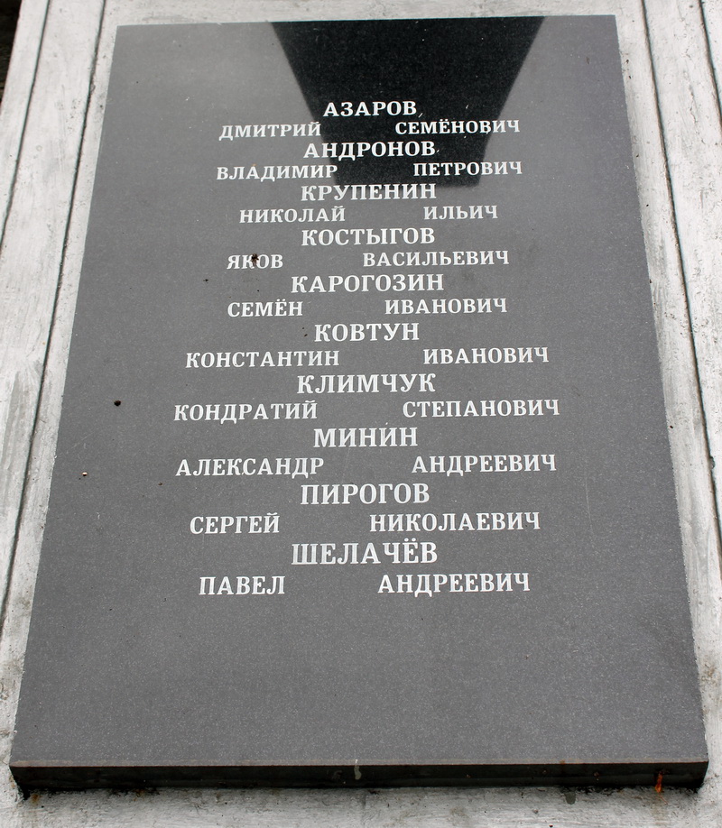 …Партийно-советские работники идут в партизанские отряды, создаваемые райкомом партии. Многие из них погибают в сражениях с врагом, (они захоронены в братской могиле «Слава»). Сланцевчане обязаны знать своих земляков, отдавших жизнь во имя мира. Здесь покоятся вечным сном: Д.С.Азаров — секретарь РК ВКП(б), комиссар партизанского отряда, В.П.Андронов — транспортник, командир партизанского отряда, С.И. Карагодин — работник ремонтно-механического завода, боец партизанского отряда, К.С. Климчук — первый секретарь РК ВКП(б), командир партизанского отряда, К.И.Ковтун — председатель рудкома, боец партизанского отряда, Я.В.Костыгов — председатель постройкома РМЗ, партизанский командир; Н.И. Крупенин — строитель, боец партизанского отряда, А.А. Минин — второй секретарь РК ВКП(б), комиссар отряда, С.Н.Пирогов — начальник Большепольской погранкомендатуры, командир партизанского отряда, П.А.Щелочев — строитель, боец партизанского отряда. Старожилы утверждают, что, кроме указанных фамилий на могильной плите, тут захоронены: Владимир Каневский, Яков Малков, Коля Богданов, Петя Тихомиров, связная партизанских отрядов Дарья Артемьева. А всего под памятником «Слава» 35 патриотов — сланцевчан, которым отдаем почести в даты красного календаря.