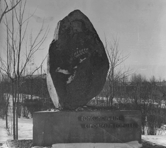 Памятник представляет собой установленный на бетонном постаменте гранитный монолит с укрепленными на нем бронзовой лавровой ветвью и комсомольским значком. Надпись на постаменте: «Комсомольцам – строителям города».