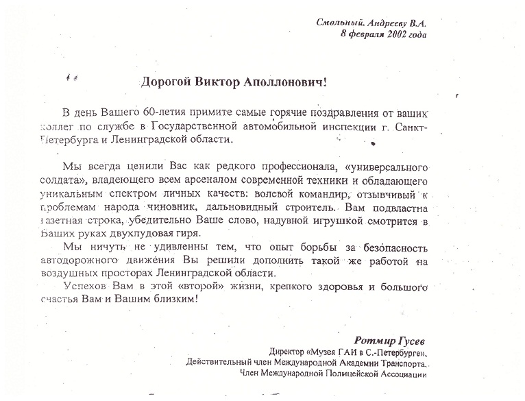 А за два года до этого случилась трагедия. В.А. Андреев ехал на встречу в Санкт-Петербург. На старом «Жигулёнке». Все поступающие в отделение новые машины нужно отдавать сотрудникам – им нужнее – такова была позиция начальника. И вот на старой, изношенной машине сломался полумост. Вышедшего из машины Виктора Аполлоновича сбил и переехал микроавтобус. Случилось это в Санкт-Петербурге на Обводном канале. Пострадавший оказался в больнице с многочисленными переломами и травмами. Они оказались настолько серьёзными, что даже врачи не верили, что после них можно выжить. А он верил в себя, в то, что ещё может принести пользу людям, и назло всем диагнозам и прогнозам выжил. Долго лечился, свыше года ходил на костылях, восстанавливал себя и морально, и физически. И всё же вернулся в свою родную госавтоинспекцию.