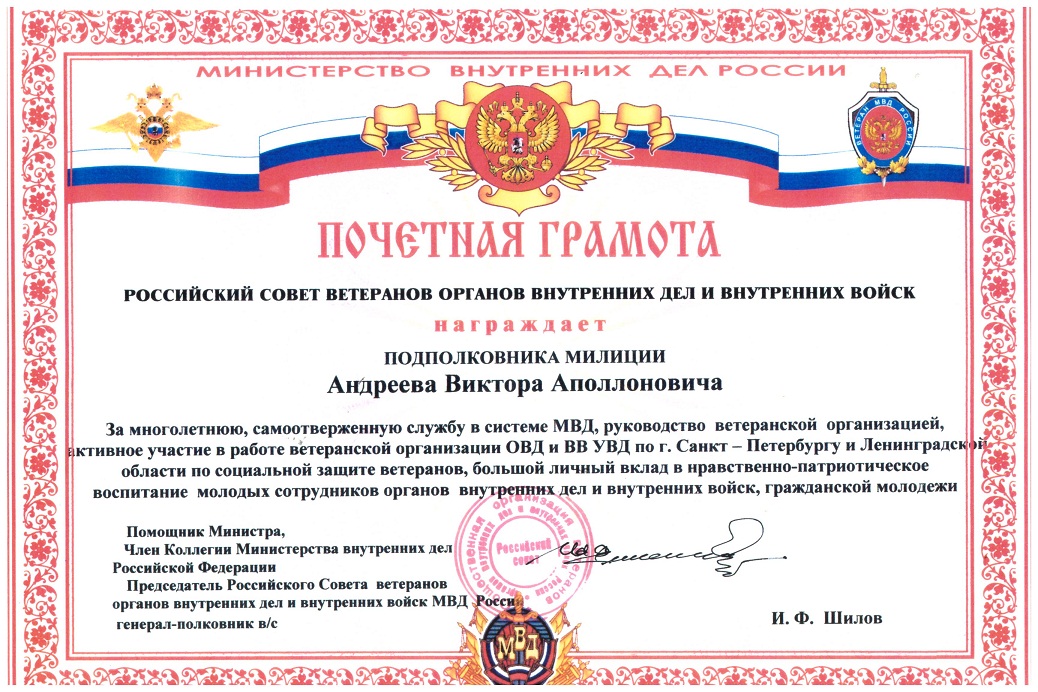 В 1995 году приказом министра внутренних дел РФ В.А. Андрееву присвоено звание подполковника милиции на ступень выше в порядке поощрения.