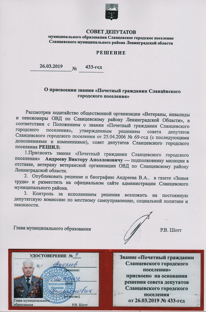 26 марта 2019 года В.А. Андрееву было присвоено звание «Почётный гражданин Сланцевского городского поселения».