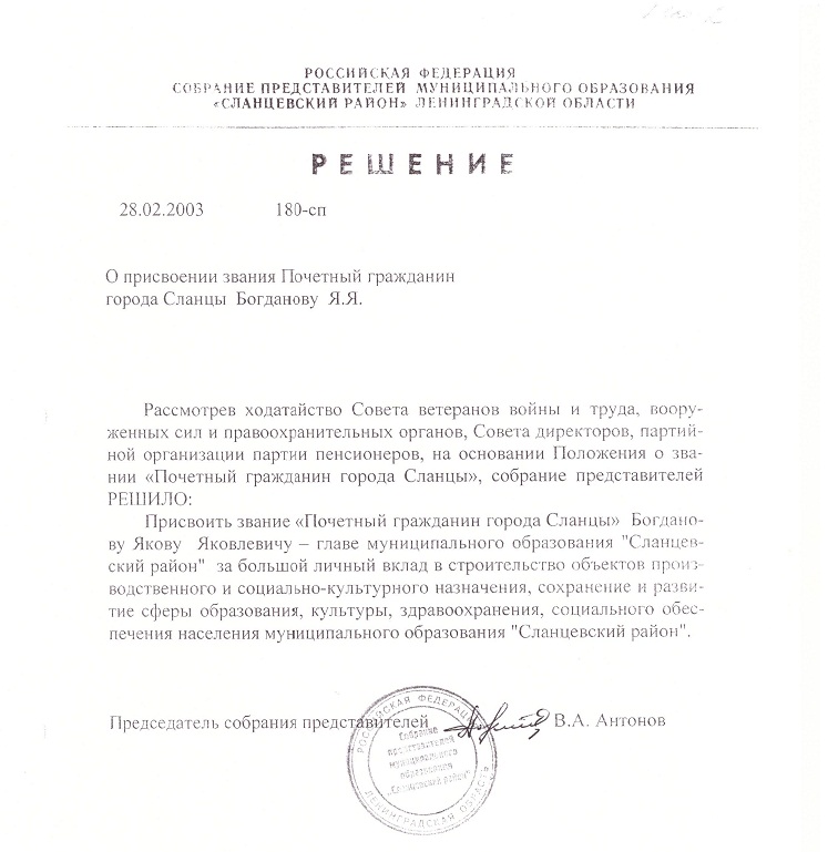 28 февраля 2003 года решением собрания представителей Сланцевского района за большой личный вклад в строительство объектов производственного и социально-культурного назначения, сохранение и развитие сфер образования, культуры, здравоохранения, социального обеспечения населения Якову Яковлевичу Богданову присвоено звание «Почётный гражданин города Сланцы».