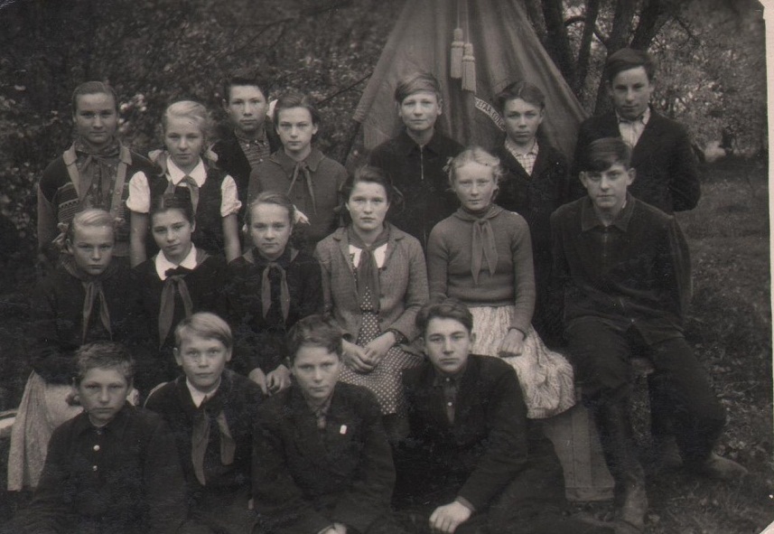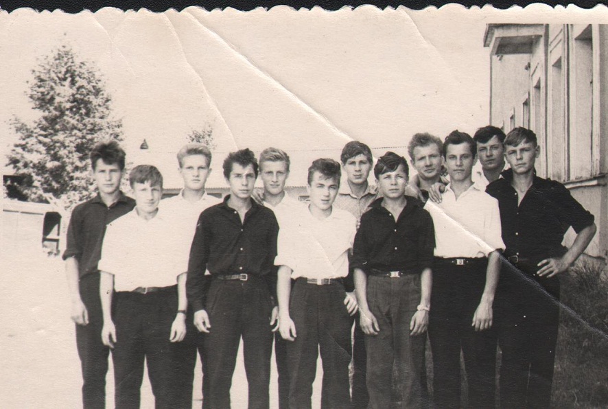 На фото: Я. Богданов - выпускник восьмого класса (верхний ряд, второй справа); группа каменщиков ПТУ №15. Я Богданов - в центре.
