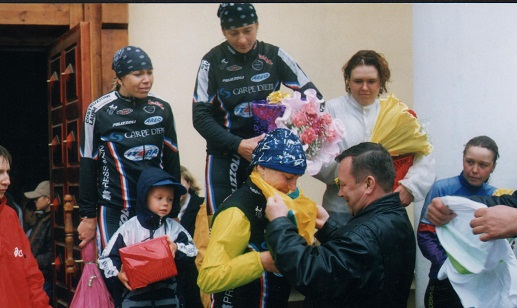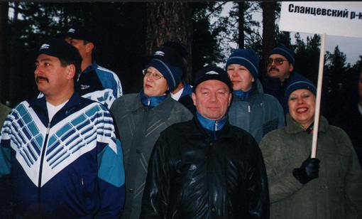 На фото: команда Сланцевского района на областном спортивном празднике; Я.Я. Богданов надевает жёлтую майку лидеру велопробега.