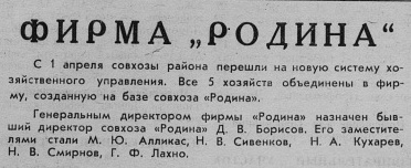 В 1975 году происходит укрупнение совхозов района, создаётся фирма «Родина». Её генеральным директором бюро обкома коммунистической партии Ленинградской области назначает Д.В. Борисова.