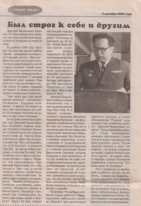 Коммунист Дмитрий Васильевич Борисов 21 год состоял членом районного партийного органа, 18 лет был членом райкома партии, 25 лет избирался депутатом городского совета народных депутатов.