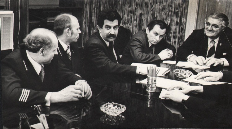 На снимке( справа налево): А.И. Петров, председатель профсоюза работниокв угольной промышленности; Э.Я. Ткаченков, секретарь партийной организации; генеральный директор ПО "Ленинградсланец" Г.Б. Фрайман; начальники участков.