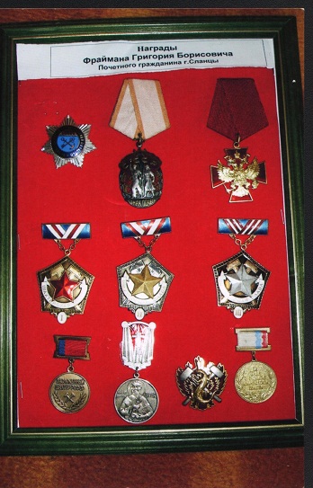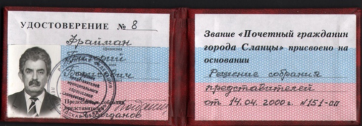 14 апреля 2000 года Григорию Борисовичу Фрайману присвоено звание «Почётный гражданин города Сланцы».
