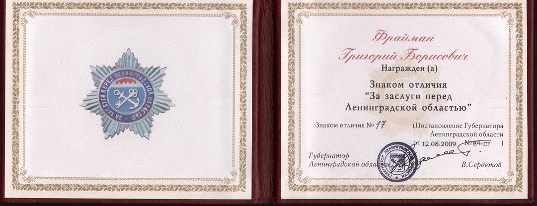 В 2009 году Григорий Борисович был награждён знаком отличия "За заслуги перед Ленинградской областью".