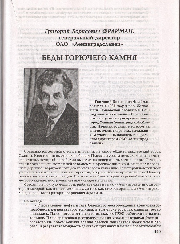 "Чёрное золото Сланцев" - интервью Генерального директора ОАО "Ленинградсланец" Г.Б. Фраймана ежемесячному научно-производственному журналу "Уголь", 9/2004.