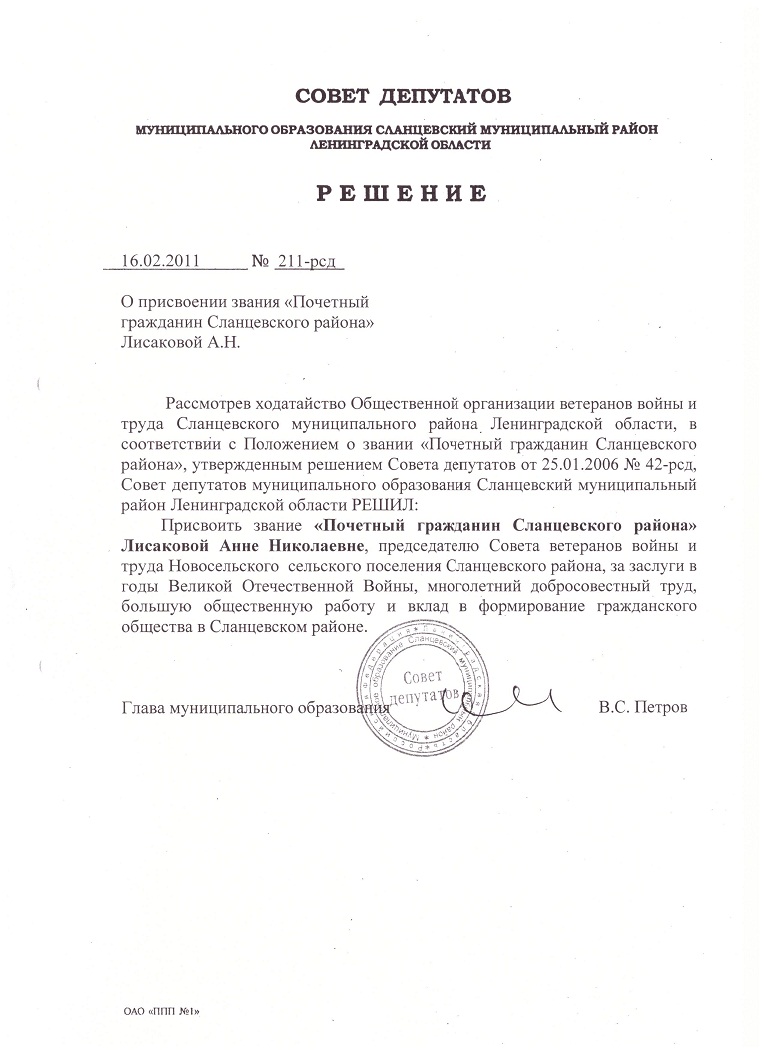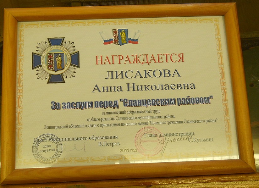Решением совета депутатов Сланцевского муниципального района от 16.02.2011 № 211- рсд Анне Николаевне Лисаковой, председателю Совета ветеранов войны и труда Новосельского сельского поселения Сланцевского района, за заслуги в годы Великой Отечественной Войны, многолетний добросовестный труд, большую общественную работу и вклад в формирование гражданского общества в Сланцевском районе присвоено звание «Почётный гражданин Сланцевского района».