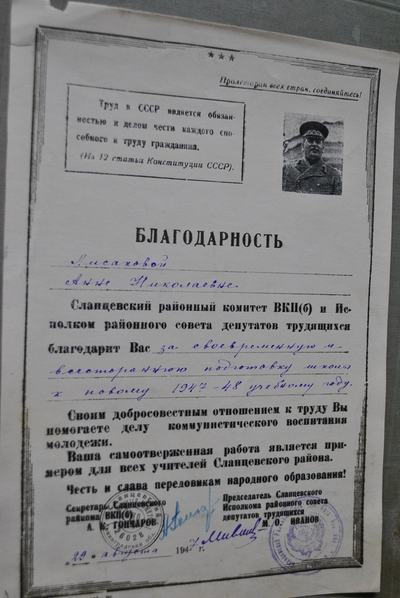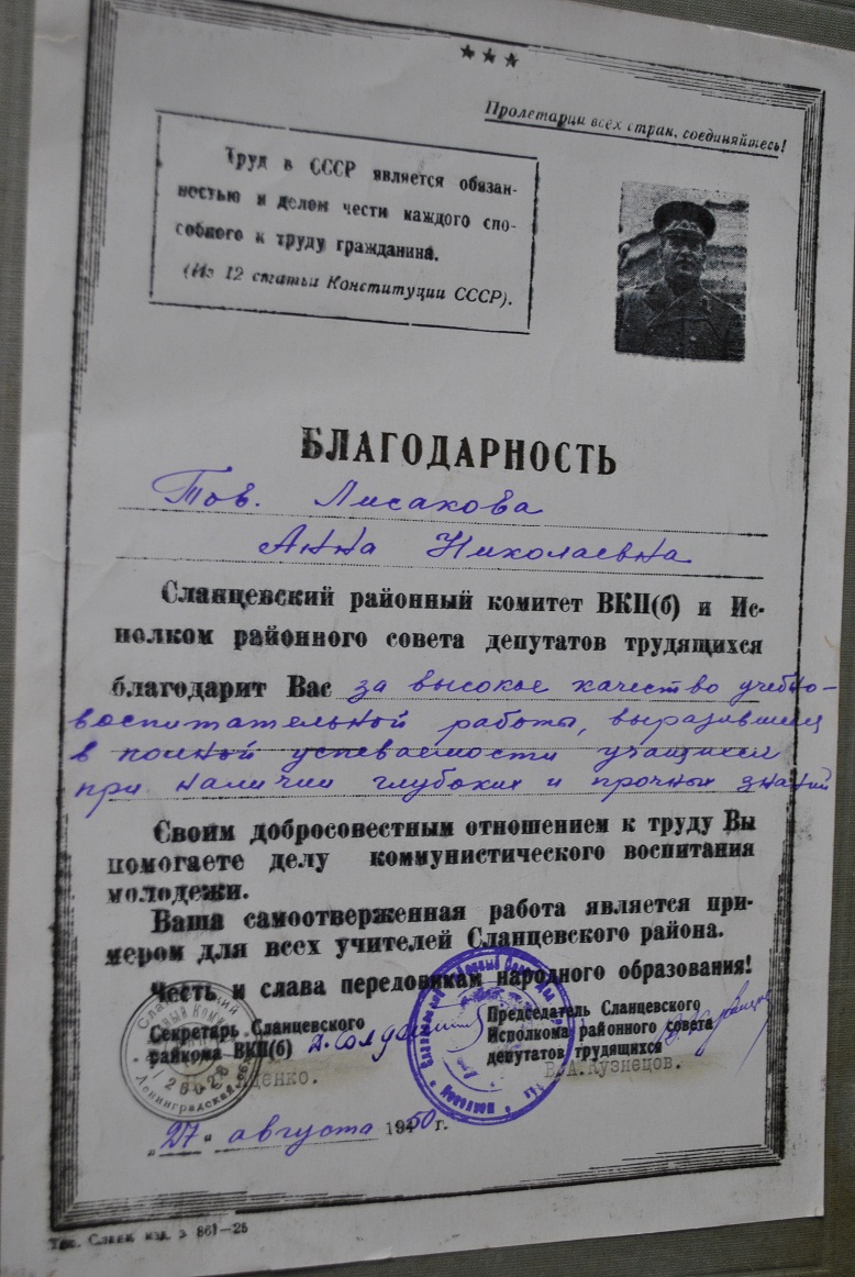 Лисакова Анна Николаевна родилась в многодетной семье в д. Перницы Сланцевского района. Трудовую деятельность начала в 1940 году, после окончания Гидовского педагогического училища учителем в школе д. Великое село.