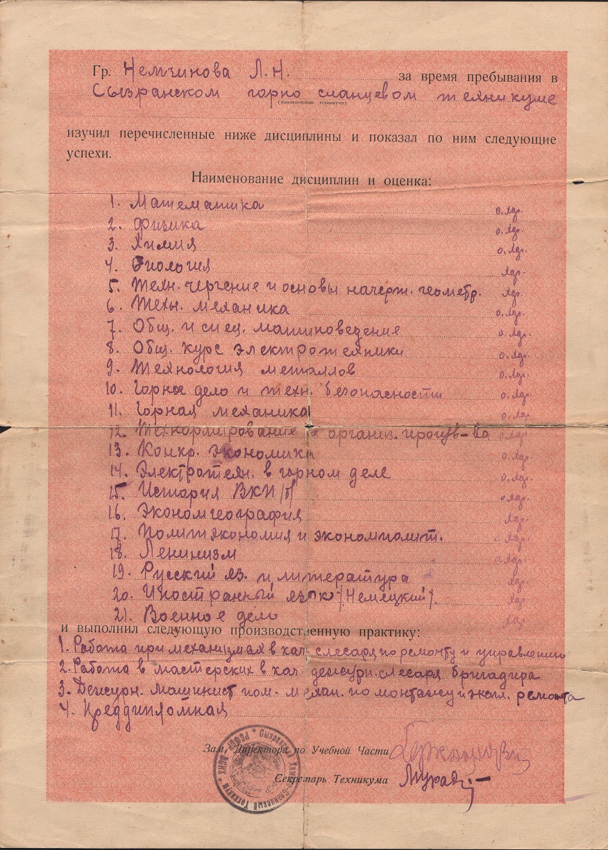 Как вспоминала Л.Н. Немчинова в интервью газете «Знамя труда» (16 июля 1994 г. «Верность делу»), в техникуме преподавание вели по учебникам высшей школы, поэтому багаж знаний был получен хороший.