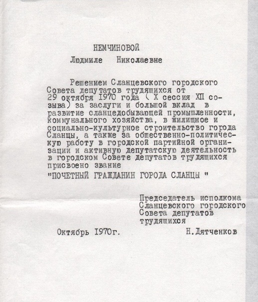 Л.Н. Немчинова принимала активное участие в общественной жизни города. С 1953 по 1972 годы избиралась депутатом городского Совета, все эти годы возглавляла постоянную комиссию по строительству. Под её руководством был строгий депутатский контроль всех строящихся объектов. На промышленных предприятих, например, на цементном заводе, проводили выездные заседания, слушали отчёты о ходе строительства, организовывали депутатские посты. В период действия Совнархозов деятельность постоянной депутатской комиссии также распространялась на промышленные объекты городов Кингисепп и Ивангород.