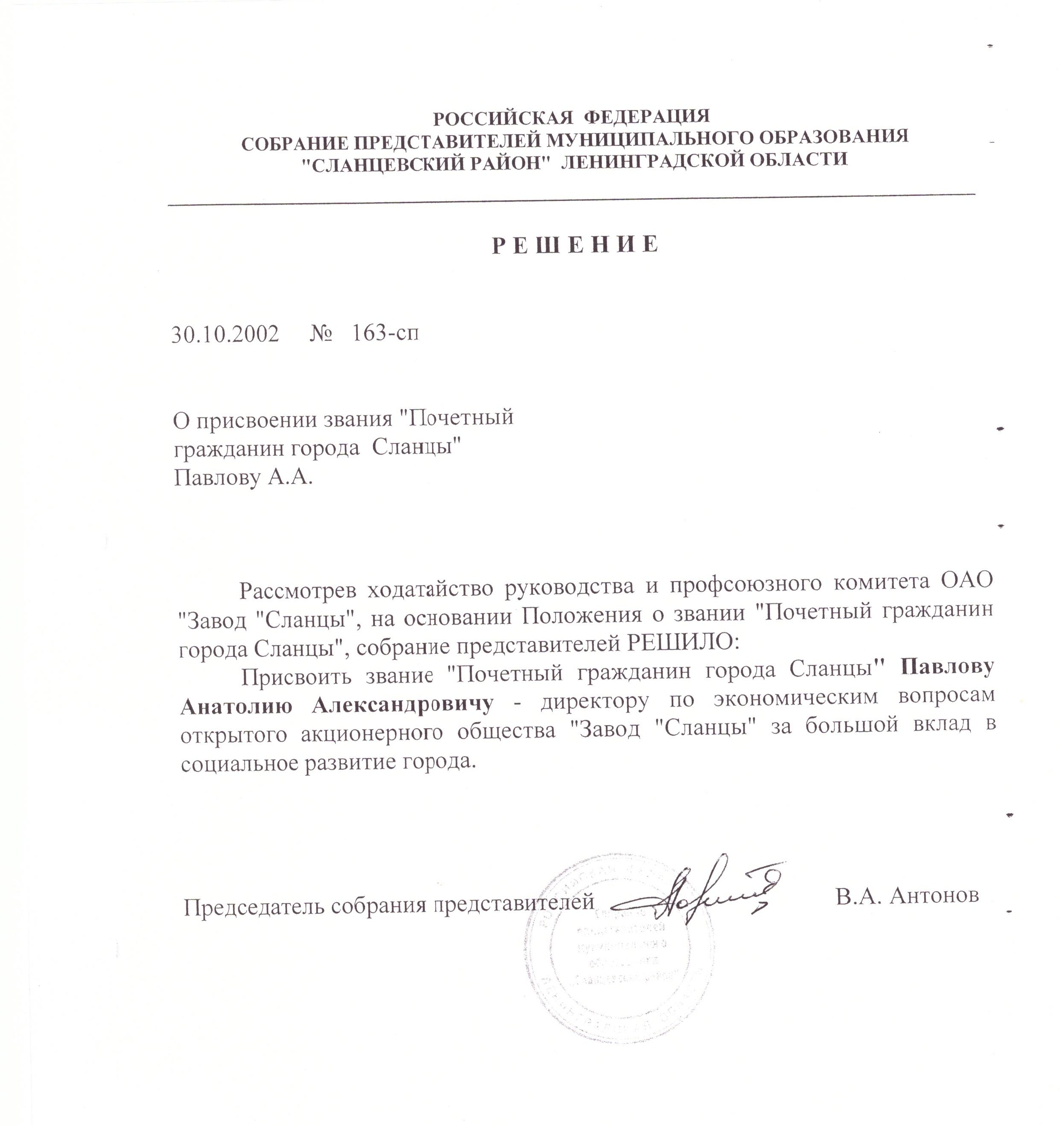 Решением собрания представителей муниципального образования «Сланцевский район» Ленинградской области А.А. Павлову 30 октября 2002 года за большой вклад в социальное развитие города было присвоено звание «Почётный гражданин города Сланцы».