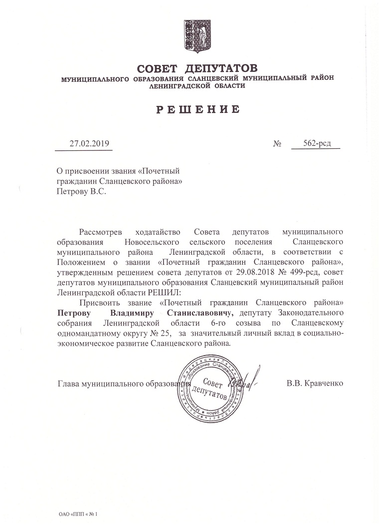 Решением совета депутатов Сланцевского муниципального района от 27.02.2019 № 562-рсд Петрову Владимиру Станиславовичу, депутату Законодательного собрания Ленинградской области 6-го созыва по Сланцевскому одномандатному округу № 25, за значительный личный вклад в социально-экономическое развитие Сланцевского района присвоено звание "Почётный гражданин Сланцевского района".