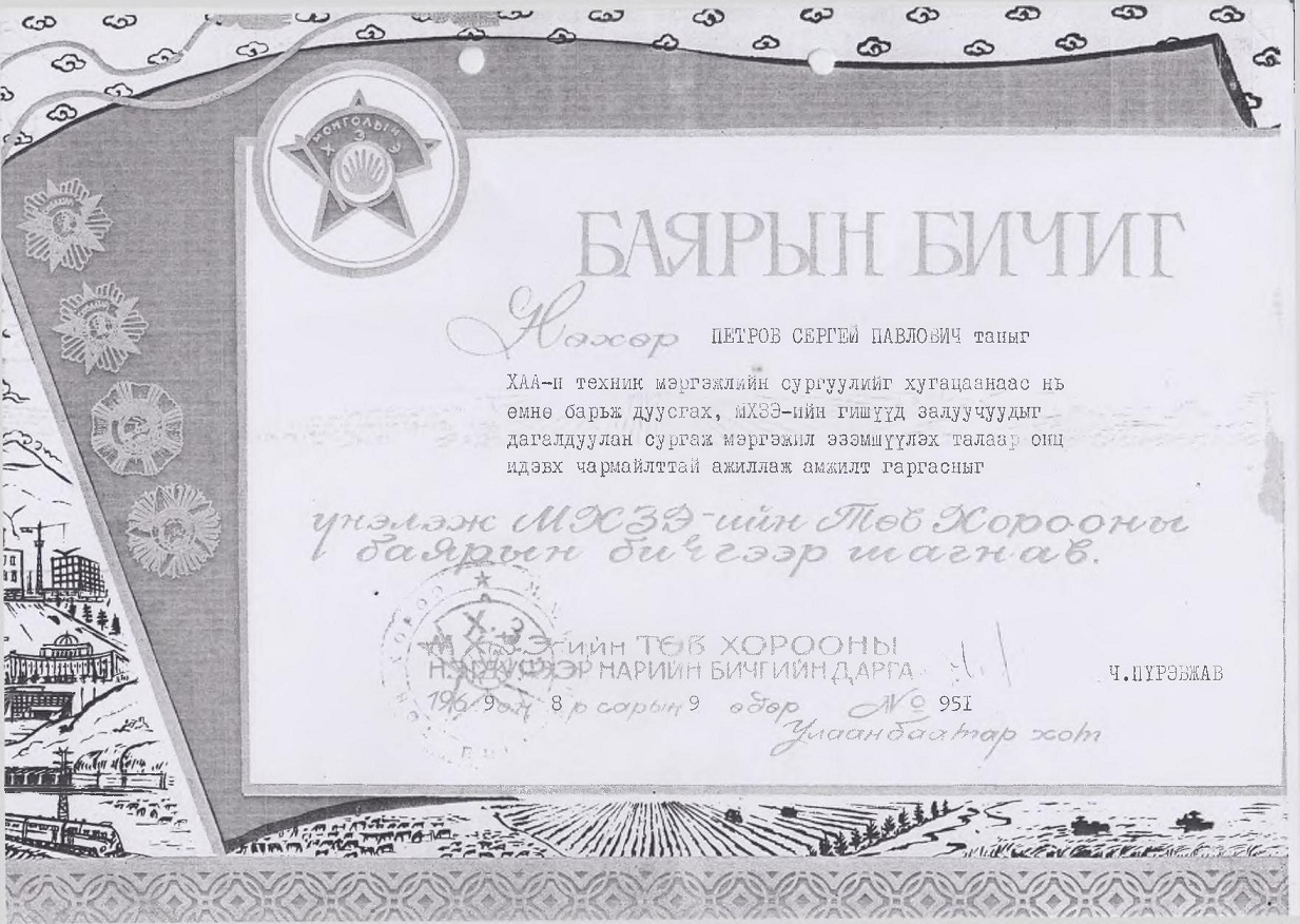 В 1967 году Сергей Павлович, как хороший специалист и организатор, был направлен в двухгодичную командировку в Монголию, где помогал строить жилые дома, социально-культурные объекты. В Монголии Сергей Павлович работал как дома – самоотверженно, с огоньком. Об этом свидетельствует полученная из Монголии Почётная грамота.