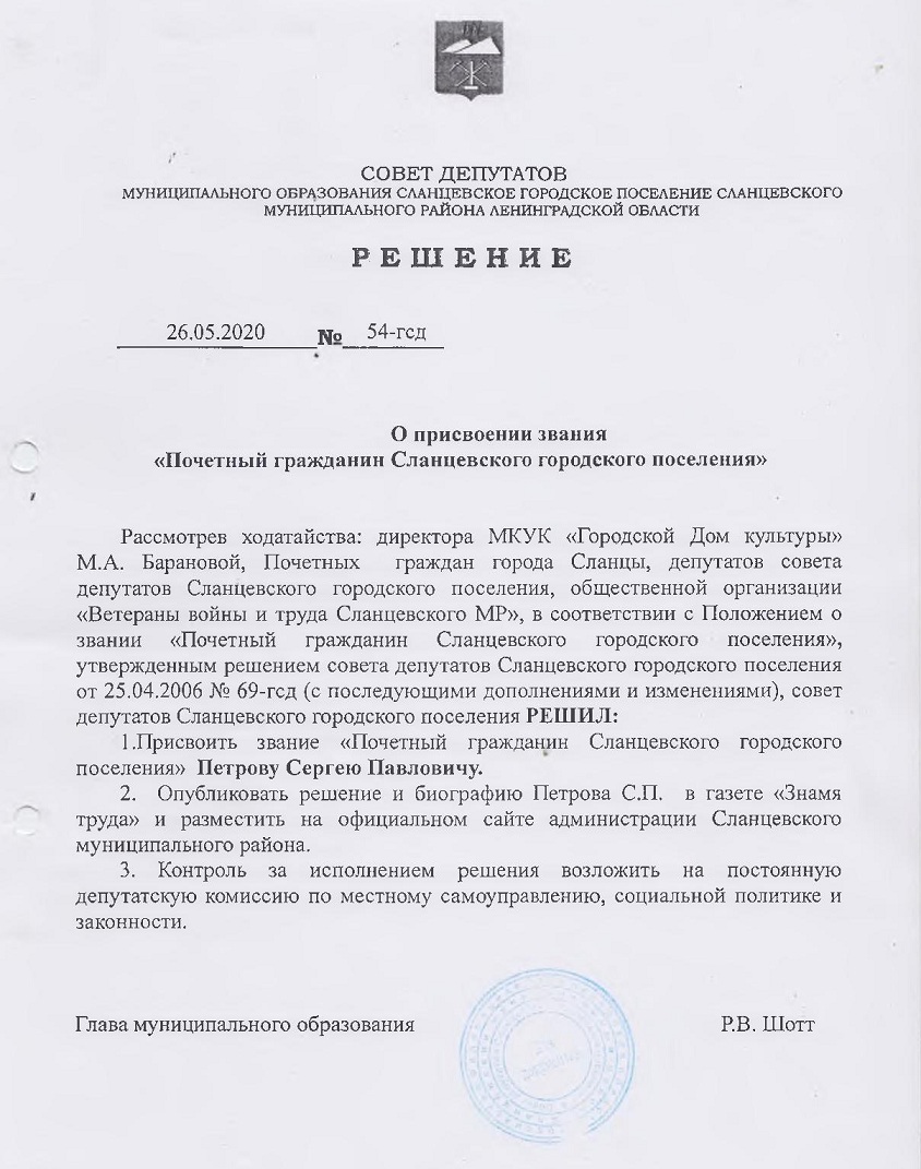 26 мая 2020 года решением Совета депутатов Сланцевского городского поселения Сергею Павловичу Петрову присвоено звание «Почётный житель Сланцевского городского поселения».