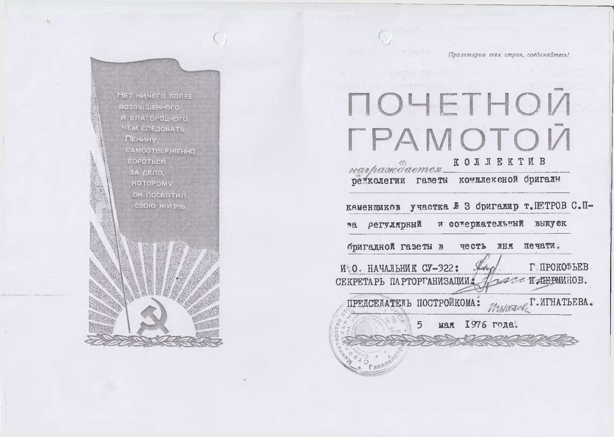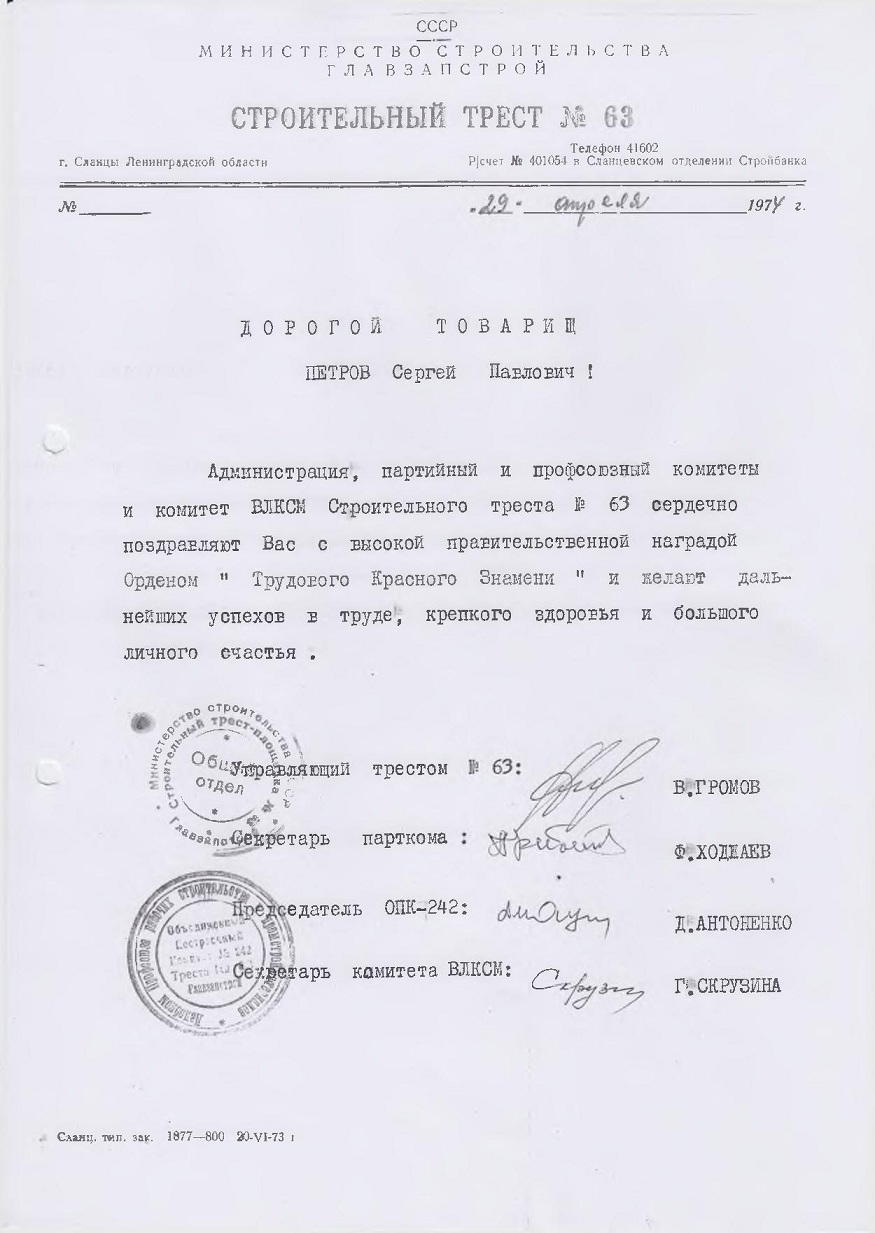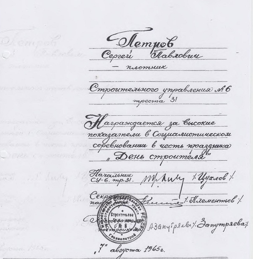 Бригадир каменщиков СУ-322 строительного треста №31 Сергей Павлович Петров награждён орденом «Трудового Красного Знамени», орденом «Дружбы народов». Неоднократно награждался Почётными грамотами треста, строительного участка, городского комитета партии и комсомола.