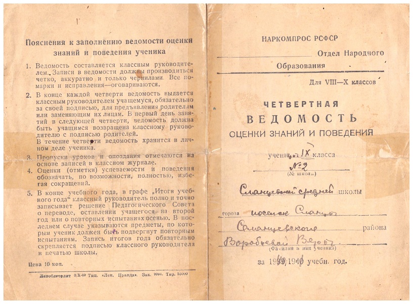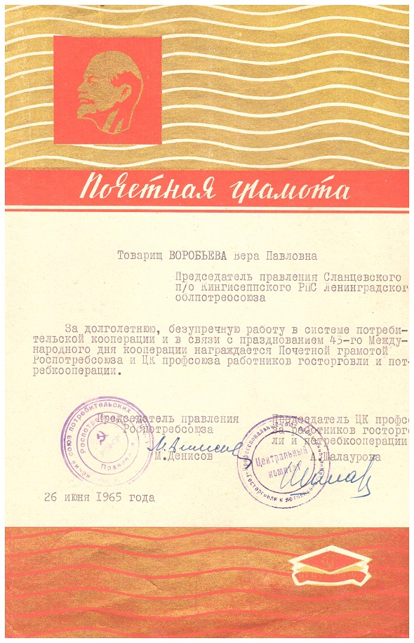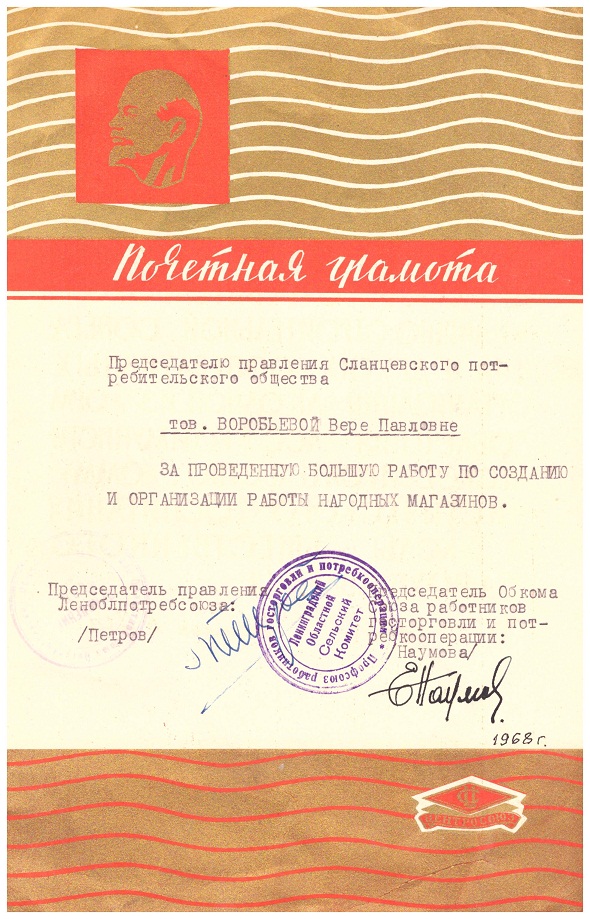 16 октября 1958 года В.П. Воробьёва была избрана председателем правления Сланцевского райпо и работала в этой должности до 20 января 1986 года.