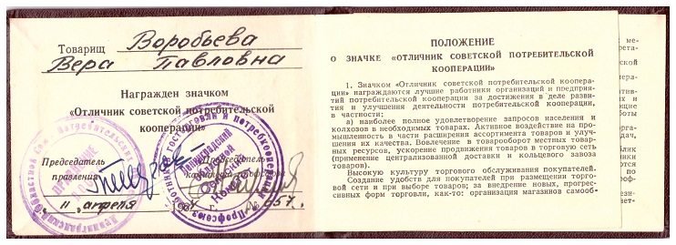 1964 г. - «Отличник Советской потребительской кооперации»;