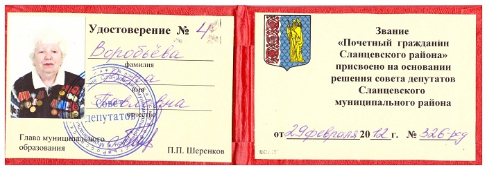 Решением совета депутатов Сланцевского муниципального района от 29.02.2012 № 326-рсд, на основании ходатайства почётных граждан Сланцевского района и города Сланцы Вере Павловне Воробьевой — ветерану Великой Отечественной войны, Ветерану труда, задоблестный труд в годы Великой отечественной войны, трудовые заслуги в ходе восстановления разрушенного хозяйства Сланцевского района, значительный вклад в сохранение и развитие потребительской кооперации и улучшение качества жизни населения района, а также большую общественную работу по патриотическому воспитанию подрастающего поколенияприсвоено звание «Почётный гражданин Сланцевского района».