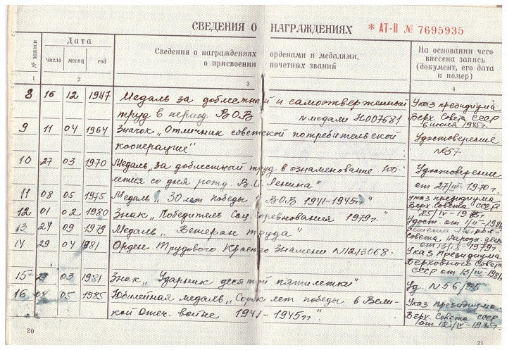 1947 г. - медаль «За доблестный труд в период Великой Отечественной войны 1941-1945 гг.»;