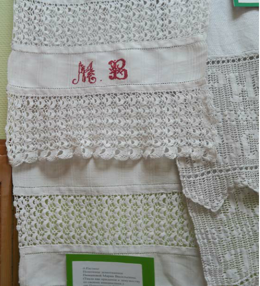 Домотканное венчальное полотенце с вышитыми инициалами Пимановой Марии Васильевны от Перекатовой Т.Н. (д.Кислино);