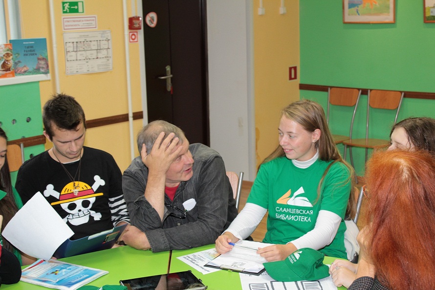 В 12 часов, в течение часа, все пытались «Изобразить свою эмоцию НЕ БОЯСЬ ИРОНИИ! Смеяться… над собой!». Стартовали сразу две встречи: открытие выставки рисунков юной Сланцевской художницы Анастасии Гришиной и интеллектуальный арт-челлендж с Валентином Головиным и Людмилой Степановой «Что может скрывать или хранить книга в твоей семье?».