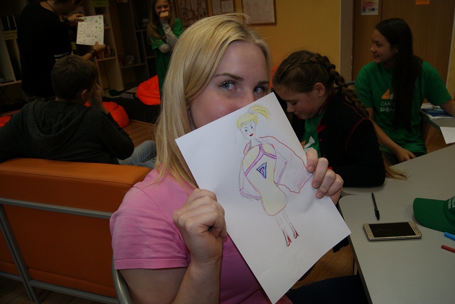 13 часов творческий вызов от Владимира: «Нарисуй то, чего нет, а значит это нельзя нарисовать неправильно.» После краткого экскурса в мир картинок и слов, Владимир дал задание ребятам нарисовать Сланцевского супергероя. Вот это да!!! Анастасия Прокофьева, лидер чтения Молодежного библиотечного центра «МОСТ» создала Тапко-women. Эта дама, тело которой, представляет собой пляжный тапочек «сланцы», она выходит на улицы только ночью, а на ногах у этой красавицы лабутены.