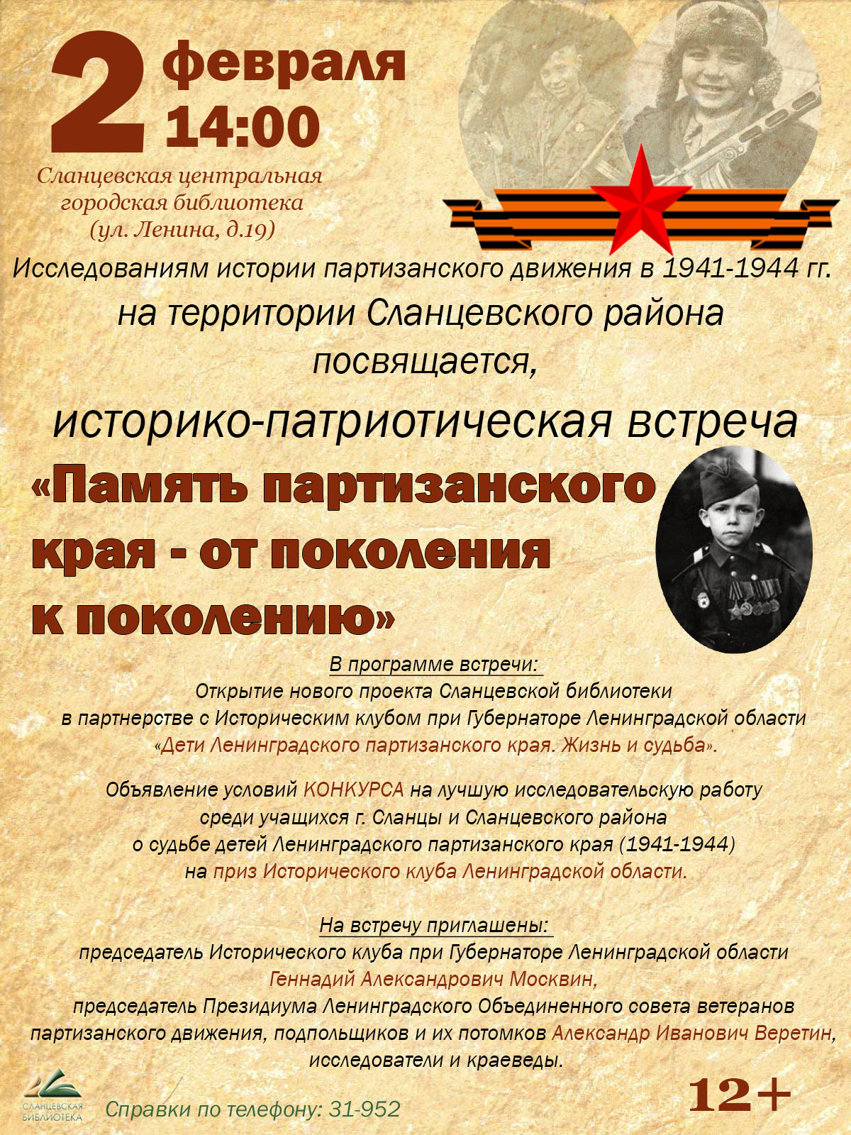 В Сланцевском районе стартовал Год истории, посвященный 90-летию образования Ленинградской области. Он начался 2 февраля историко-патриотической встречей «Память партизанского края – от поколения к поколению», которая открывает совместный военно-патриотический проект Сланцевской библиотеки иИсторического клуба Ленинградской области «Дети Ленинградского партизанского края. Жизнь и судьба»: конкурс на лучшее историческое исследование о судьбе детей Ленинградского партизанского края (1941-1944) среди учащихся Сланцевского района.