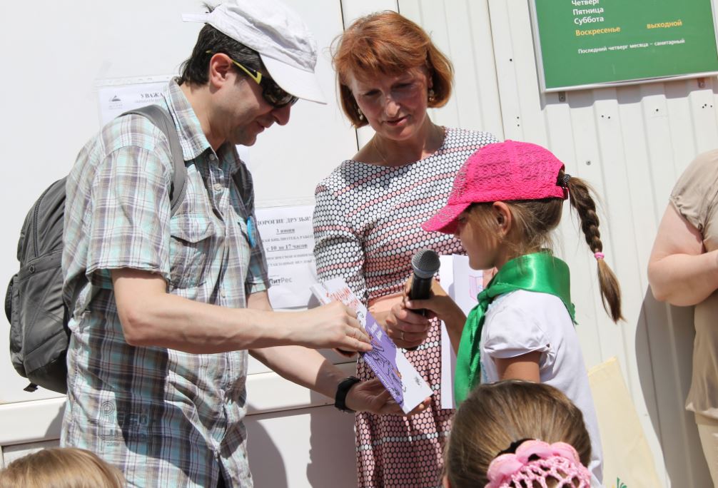 3 июня, в 11 часов фестиваль начался еще с одной уличной акции волонтеров. Волонтёры предлагали жителям города ответить на забавные вопросы, связанные с историей фестиваля и творчеством его гостей-писателей: