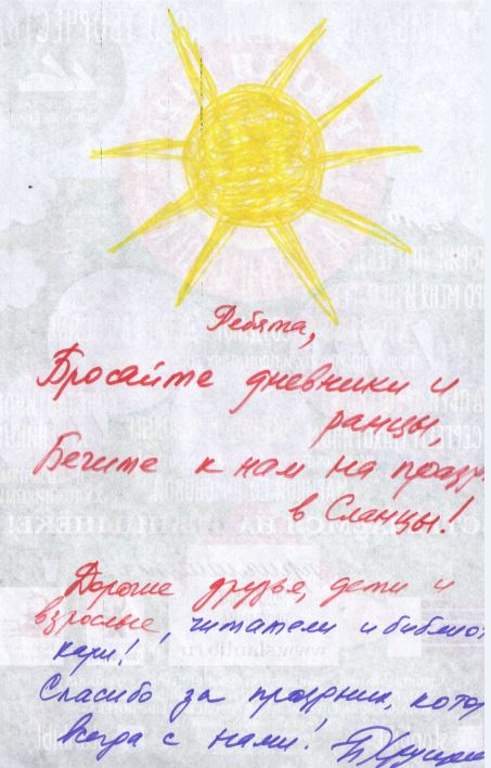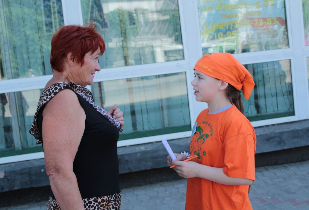 «Я сегодня была волонтёром на уличной акции. Мы задавали вопросы прохожим. Некоторые проходили мимо, а некоторые отвечали с удовольствием. А ещё мы рисовали стрелки в направлении на фестиваль «Солнечные Встречи».