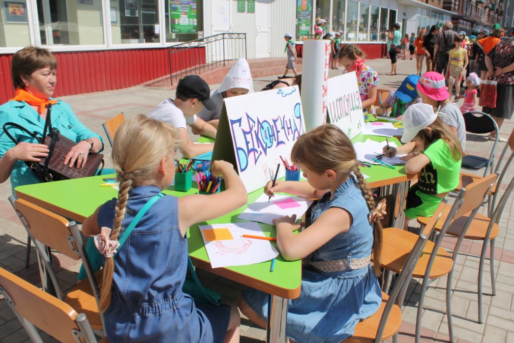 На площадке «Рисунки на асфальте» дети создавали свои истории в рисунках. Они нарисовали много цветов и солнышек, весёлых человечков.